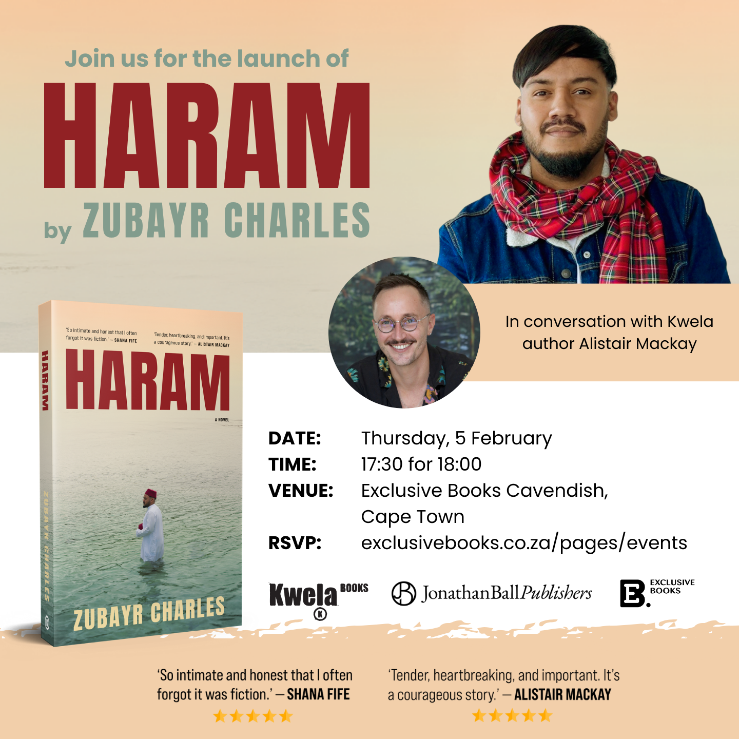 Book: "HARAM" (A Novel) by Zubayr Charles Date: Thursday, 5 February Time: 17:30 for 18:00 Venue: Exclusive Books Cavendish, Cape Town Special Guest: In conversation with Kwela author Alistair Mackay RSVP: exclusivebooks.co.za/pages/events
